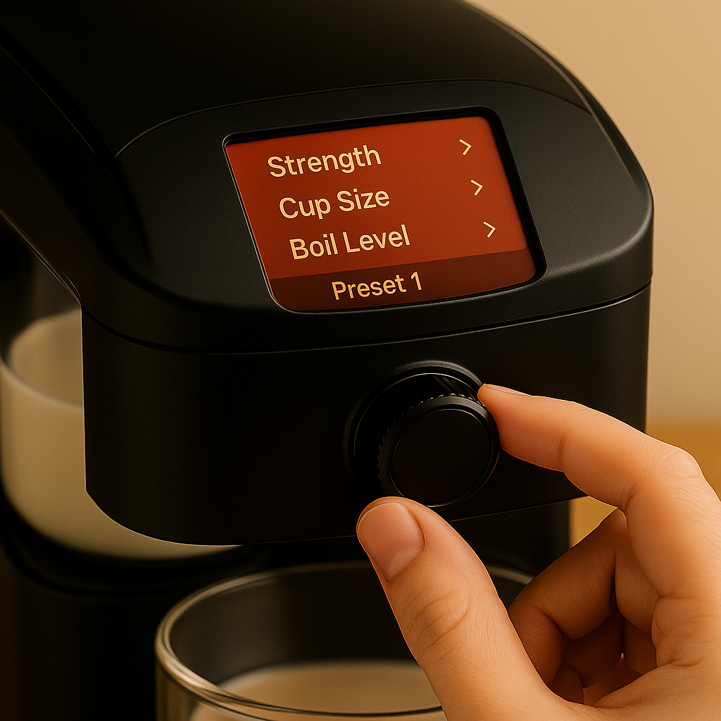 Choose your desired strength, cup size, and boil level using the rotary knob and display, or simply tap your saved preset.